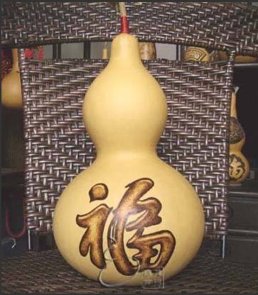 中华民族有着一种特殊的思维方式--象征主义。葫芦的"蔓"与万谐音,每个成熟的葫芦里葫芦籽众多,人们就联想到"子孙万代,繁茂吉祥"葫芦谐音"护禄""福禄",人们认为它可以祈求幸福。讲究一些,则用红绳线串绑五个葫芦,称为"五福临门"。