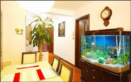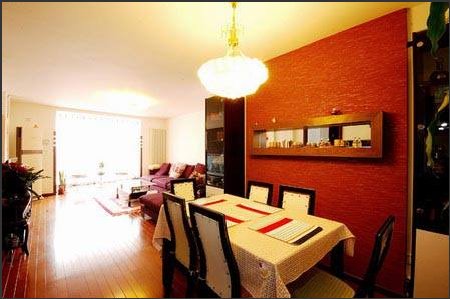 装修时由于餐厅处于一角落,所以背景采用镜子的装饰,就像一双明媚的眼睛。紫红色的背景壁纸突出了区域的划分,胡桃木方型造型的介入更显得稳重得体。