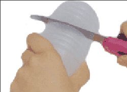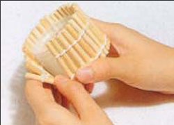 4、竹筷上下两端均以同样方法缠绕,直到足够围绕塑胶皿外围的长度为止,便可将它粘贴固定,最后可再加上一圆形木块做底座,增加美感。