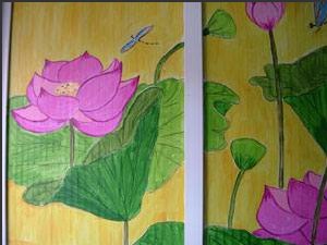 大家如果用丙烯颜料画完要记得及时洗笔和洗调色板,否则干了就洗不掉了,笔发硬了也就不能用了。建议准备两个洗笔筒,一个洗颜色,另外一个倒一点洗笔液(美术商店有卖,5元/罐),把笔泡着能洗掉剩余的颜色。因为荷花是用油性笔勾勒的,色彩渗出厉害。加上油性笔不能覆盖原来的铅笔底稿,所以近看效果不太好。