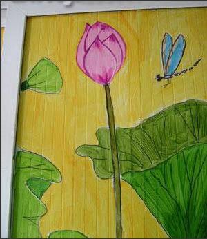 这个蜻蜓原来不是这样的,翅膀要小一圈,而且因为我没有抓到过蜻蜓,一时也想不起来蜻蜓是什么样子,所以画了两个触角上去。画好以后老公都表示满意,但是说了一句话让我郁闷半天“为什么荷花边上要画蚊子呢?”。于是赶忙找资料,终于想起来蜻蜓是没有触角的,是两个大眼睛,赶紧拿油性笔把眼睛描出来,但是触角太长了覆盖不了,所以蜻蜓看起来好像多了个嘴巴,再把翅膀描描大,总算像蜻蜓了。