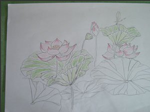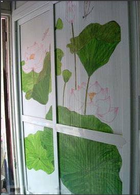 塑钢上面用铅笔打底色,万一不好看可以擦掉。我选的是荷花的图案,用油性记号笔描了一下叶脉。