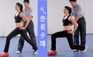 气垫箭步蹲。结合了腹肌和竖脊肌的练习。动作: 前后大跨步,前脚踩在气垫上,后脚前脚掌着地。左右腿换侧重复3组,每组15次。后下蹲。前膝屈至直角,后膝指向地面,保持身体平衡30秒。