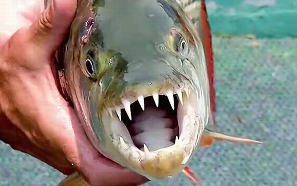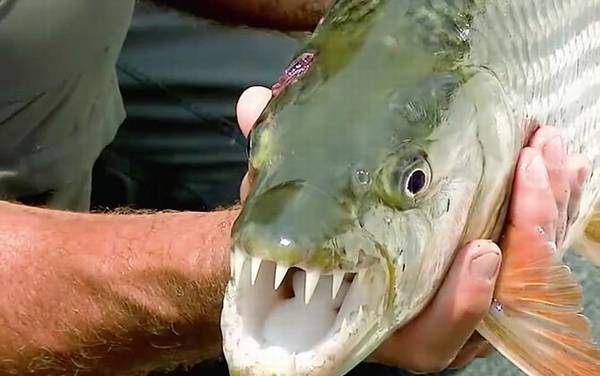 巨型水虎鱼是凶猛的肉食性鱼类,别称非洲虎鱼、非洲猛鱼等,在生物学分类上属于动物界、脊索动物门、硬骨鱼纲、鲤形目、脂鲤科、狗脂鲤属多种鱼类的统称,性情凶猛且贪食,嘴巴上长着数十颗锋利的牙齿,常成群结队的捕猎,常见的有巨狗脂鲤、狗脂鲤、短身狗脂鲤、福氏狗脂鲤、坦贊狗脂鲤五种。