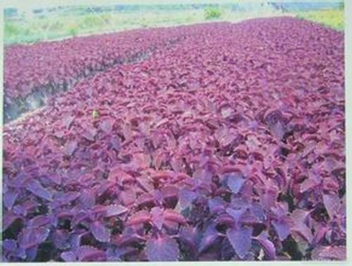 彩叶苏〔Coleus scutellari-oides (L. ) Benth. A)又名洋紫苏、彩叶草,为唇形科鞘蕊属 的多年生常绿草本植物。植株高50~90厘米,全株被茸毛。 叶卵形,表面粗糙,边缘有锯齿,颜色多种,有紫、红、黄、 绿等,叶面满布斑点,色彩斑谰,绚丽多姿,给人以五彩缤 纷、繁华似锦的景观,为优美的观叶植物。总状花序淡蓝色 或带白色,通常以观叶为主。适于盆栽布置窗台、门前、街 道及展厅、候机室等处。也宜于露地栽培在花坛、花径等处, 作镶边花卉或配置图案,与彩色花共种,花叶并繁,纷彩华 丽。亦可作切花材料,剪取插入玻璃瓶中,可在水中发根 (149)。同类观叶植物极多,变种小彩叶苏(var. cnspipilus),植株较小,宜小盆栽植吊挂于棚架或置台案。同 属的彩叶草(C. blumei),叶美丽,栽培亦较多,其余尚有 紫叶苏、彩边苏等,亦可栽培供观赏。