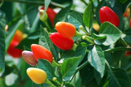 五彩椒原产于热带美洲,现 已植于世界各地,我国南北均有栽培。喜生于气候温暖、曰 照较长、空气干爽的环境。在华南地区,可在室外安全越冬, 作多年生或越年生植物栽培。但一般只作1年生植物栽培,秋 后剪去老茎,翌年重新种植。华中及华北地区均只能作1年 生栽培。为喜光性植物,喜通风向阳地,不耐荫蔽及干风吹 袭。适宜于土壤肥沃湿润、排水良好的沙壤土,切忌积水地, 水浸稍久,即萎蔫死亡。浇水亦不宜过多,夏日高温多雨季 节,盆栽的植株,可移至避雨处,以免过湿引起落花落果以 至枯萎。易染立枯病,育苗或盆栽用土,应选用生荒土或注 意消毒,对于近年曾种植过茄科植物的土壤,一般应避免使 用,以防发病。种植时放足基肥,肥料充足的植株,观果期 可相应延长。苗期施稀薄氮肥水追苗,但不宜施用过多,以 免徒长枝叶引起倒伏,花果期以施用磷钾为主的复合肥较宜。