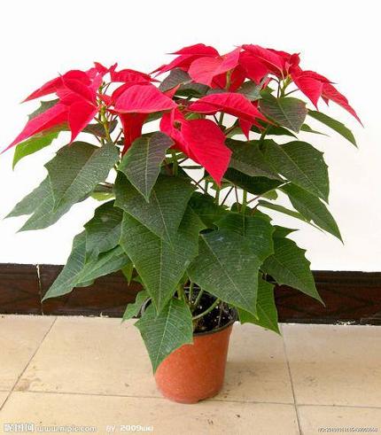 一品红(Euphorbia pulcherrima Willd.)又名老来娇、圣诞树、猩猩木,为大戟科大戟属的常 绿灌木,株高达3米,盆栽多为1米左右,叶长椭圆形,有 时为琴形,表面翠绿平滑,背面有茸毛,进入冬季,老叶转 为碧绿色,嫩枝近花处生出十多张朱红色叶片,常被误为花 苞,红绿相衬,老而转艳,大红冠顶,故有一品红,老来娇 等名。花期适逢圣诞节,教堂等处多有栽培,故又名圣诞树。 花序顶生,总苞淡绿色,每苞片有大而黄的腺体,散布于红 叶中央,点缀成景,为优美的观红叶植物。也是喜庆之花,婚 姻喜庆、节假日团聚、店铺开张等,多用此花以志庆。适宜 于成丛种植在花坛中心或成带状种植于花坛周边、花径两侧 或单株种植于庭院、公园、水滨等处,作冬季园林的主要景 色。也是重要的盆栽花卉,经矮化的植株,盆栽置阳台、门 前、店铺前或布置会场、喜庆场合、主席台等,景色殊佳。花 期长,从11月份至翌年3月份,经历圣诞、元旦、新春、元 宵等佳节,可增添节日气氛。花枝可剪下作切花,瓶插或作 花篮等,均美丽。园艺品种有一品白,近花嫩叶白色;一品 粉,嫩叶粉红色,均美丽,可供观赏。