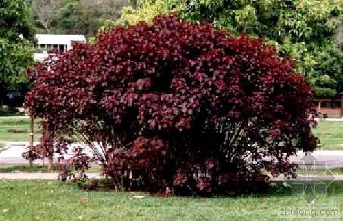 肖黄栌(Euphorbia cotiniflin L.) 又名红叶鸟桕,为大戟科大戟属的常绿大灌木至小乔木。树 高5~8米,树冠圆整,分枝颇多,嫩枝暗红色,稍肉质,着 叶处稍肥,具腺点。叶柄纤细,长约3厘米,一株树上常有3叶轮生或2叶对生。叶广卵形,全缘,两面秃净,紫红色, 叶脉明显,深红色,稍呈盾形,中脉不达叶的基部。著名的 红叶观赏树种,如枫、槭等,大都为秋日遇霜而红,肖黄栌 却是从春至冬,常年红叶,浓艳华丽,高贵凝重,与万绿林 丛,相映成景,如林中佳丽。又因红色显示吉利,很适于庭 院、公园等处,或植于水滨,相映成景,或点缀草坪,红绿 相衬。经矮化后,可作盆栽,陈列于店铺前或婚姻庆典处,以 示吉祥,为近年引入的观叶树种,较有发展前景。