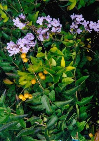 假连翘 (Duranta repens L.)为 马鞭草科假连翘属的常绿灌木。茎长可达6米,一般长为2~3米。多分枝,不直立,呈半攀援状,枝有剌或无剌。叶对生,边缘有锯齿。花期长,从4月中旬至12月中旬,陆续有开放, 以5~9月份为主花期。花小,高脚碟状,蓝紫色,幽静娇艳, 深受人爱,果圆形或近卵形,顶端喙尖,全年有果,以)~11 月份为成熟盛期。总状果序,悬挂梢头,橘红色或金黄色,有 光泽,如串串金粒,经久不脱落,极为艳丽,为重要观果植 物。适于种植作绿篱、绿墙、花廊,或攀附于花架上,或悬 垂于石壁、砌墙上,均很美观。枝条柔软,耐修剪,可卷曲 为多种形态,作盆景栽植,或修剪培育作粧景,效果尤佳。果 入药,治疟疾,叶捣烂可敷治痛肿。