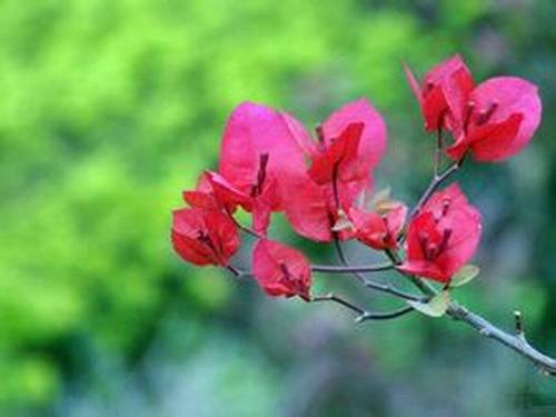 宝巾(Bougainvillea glabra Choisy)又名三角梅、九重葛、三叶梅、毛宝巾、簕杜鹃、三角花、叶子花、叶子梅、纸花、南美紫茉莉等.为紫茉莉科叶子花属 的常绿木质大藤本植物。花多数为3朵聚生于一处,花细小, 淡红色或黄色,萼管状,包藏在3片大而艳丽的苞片内,供 观赏的部分主要为苞片组成的三角状花朵,苞片近似变色的叶片,故有三角花、叶子花等名。干有剌,花色鲜艳如杜鹃, 广州、香港等地多称为簕杜鹃。花期特长,开花亦多,从夏 至冬,1年间大部分时间都是繁花似锦,绚丽满枝,为华南常见的花木。人工栽培的品种很多,苞片有紫 蓝色、朱红色、桃红色、绛紫色、橙黄色等多种,均很华丽。 另有垂瓣宝巾,亦称毛宝巾(B. spectabilis),花多聚生成团, 红艳如火,尤为美丽,很适宜于种植在公园、 花圃、棚架等的门前两侧,攀援作门辕,或种植在围墙、水 滨、花坛、假山等的周边,作防护性围篱,成为华南的一大 景观。亦可盘卷或修剪成各种图案或育成主干直立的灌木状, 作盆花栽培。老蔸可培育成粧景,苍劲艳丽,观赏价值尤高。 在园林绿化及艺花中,用途颇广。叶可作药用,捣烂敷患处, 有散淤消肿之效。