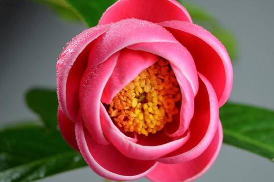 四季抱茎茶花的花朵开放时会给人眼前一亮的感觉,它的花朵是单瓣的,它的花蕊呈金黄色,它的花型很独特,具有一定的观赏性。四季抱茎茶花的叶片很大,它的叶片很宽,呈卵形或卵状披针形,它的叶片很厚实。