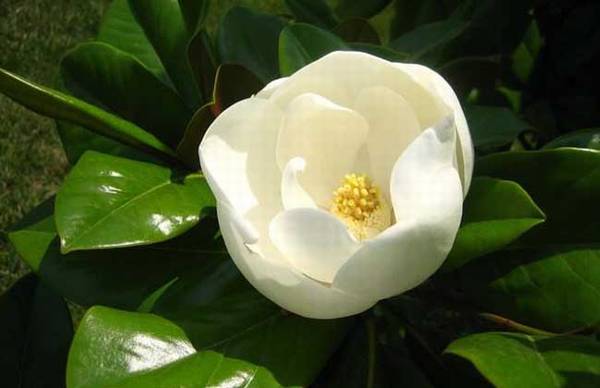 广玉兰一般在4~6月开花,以4月中旬至5月上旬多见。广玉兰开花有早有迟,在同一棵树上能看到花的各种形态,有的含羞待放,碧绿的花苞鲜嫩可爱,有的刚刚绽放,几只小蜜蜂就迫不及待地钻了进去。盛开着的广玉兰花,洁白柔嫩得像婴儿的笑脸,甜美、纯洁,惹人喜爱。远远看上去,一株广玉兰就像是一个数世同堂、生生不息的大家族。