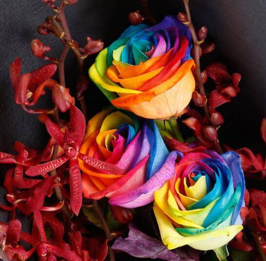首先最明显区别于本土玫瑰的是厄瓜多尔的彩色玫瑰。彩色玫瑰中最特别的一种是彩虹玫瑰,这种玫瑰一朵花上有红、黄、蓝三色,因这是厄瓜多尔国旗的主色调,这种玫瑰在厄瓜多尔也特别畅销。就颜色而论,厄瓜多尔玫瑰还有其他彩色玫瑰,黑色、蓝色、紫色的玫瑰分为吸引人的眼球。