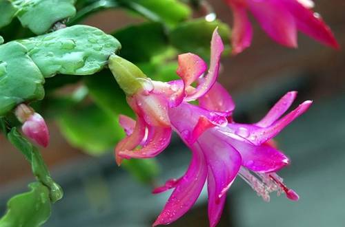 秋季蟹爪兰应放置在有早晚光照的地方培养。土干后即浇水,同时注意喷雾补充空气湿度。现花蕾后应注意水肥的供应。当气温降至10℃左右时应及时移入有光照的封闭阳台或房间内,并减少施肥次数。