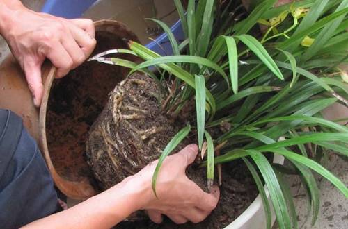 有经验的花友会在兰花分盆前停止供水3-5天,等盆中植料有七八成干时,小心将兰株与植料倒出,尽量做到不让兰根折断。用消毒水或清水洗净晾干,待兰根变软发白再上盆。上盆应采用无菌新植料,根贴植料,新株向外、老株向内,兰头露出土面三分之一。植后置于阴棚,早晚在叶面喷雾,24小时后浇足定根水,15天后转入正常管理。