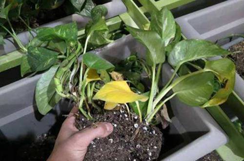第三步,修根。移栽之前,需要将绿萝根系的盘绕根、老根、过长的根系、病根、枯根、残根修剪整理后再移栽,如果修根的是损伤的根系太多,一盆的时候还需要剪掉一些叶子,减少蒸腾作用的消耗。
