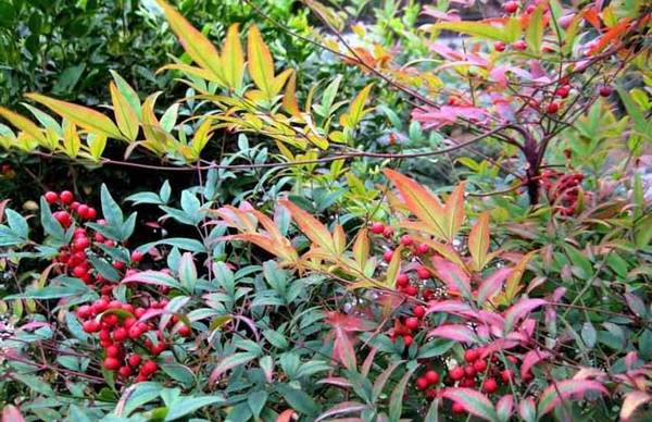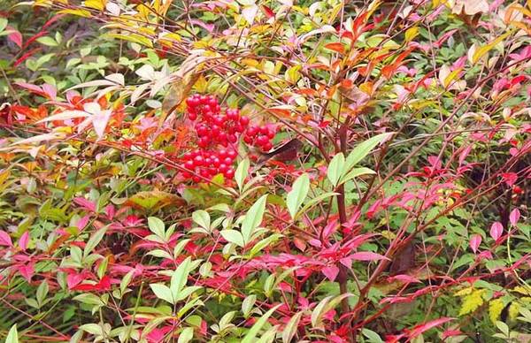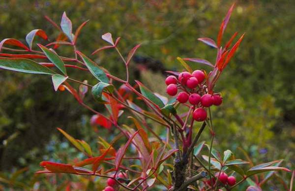 3、阳光:南天竹在半荫、凉爽、湿润处养护最好,强光照射下,茎粗短变暗红,幼叶“烧伤”,成叶变红。十分荫蔽的地方则茎细叶长,株丛松散,有损观赏价值,也不利结实。
