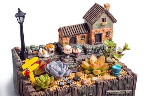 除了植物与植物装饰外,我们还可以运用苔藓、小草、石头、人物、动物、建筑物、还有各种小景观来装饰植物,让单调的盆花变成景观,来增添情趣,提升意境。