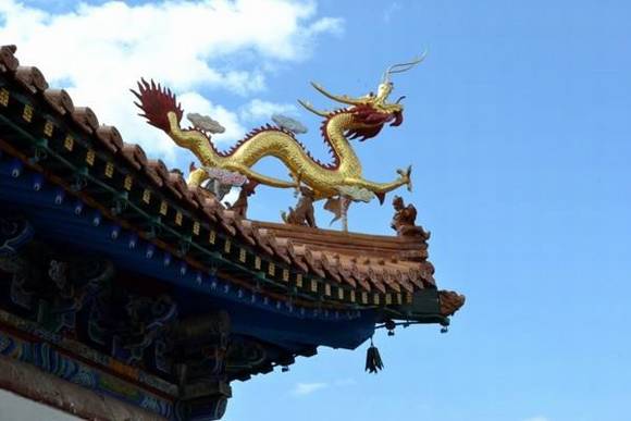 这对龙雕是用,黄泥、纸浆、糯米混合雕刻而成的,而且它最为神奇还是,它龙身之中是没有骨架来支撑的,完全凭借龙爪为支撑点空心的盘旋而上的,在龙身外面也只是刷制了一层金粉,而且经过四百多年的历史、四百多年的沧桑,龙雕至今没有掉色和裂缝的现象发生,这充分的体现了当时工匠的高超雕刻工艺,另外这对龙雕在寺庙中还有一个意义,就是象征民族团结的!!