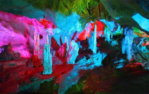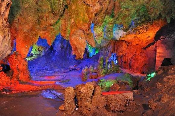 岩洞分上、中、下三层,开发游览的在中层,全长1100米,游程814米,最高处27米,最宽处50米。以雄伟、曲折、深邃著称。洞内布满钟乳石,石笋、石柱、石幔、石花等,层层叠叠,形态各异,姿态万千,构成壮丽的地下画廊,素有“神仙洞府”之称。