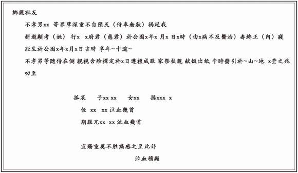 人去世后,就要给亲戚们进行通知,也称“散孝”,虽然说科学技术的进步,通讯很发达,但是散孝这是必不可少的一项程序,丧家派人去亲戚家散孝,说明安葬日期,让亲戚前来赴丧吊念。陇西有一幅常用的丧联“不迎不送丧家礼,或往或来吊者情”。朋友们丧事自愿,婚事有请,谁请谁不请,请谁不请谁,陇西人各抒已见、各有理路、各照各办、自有分寸,而邻居要孝子戴着草帽跪在门口前去请,也会在送丧的前一天在大门口贴出“讣闻”,来告知乡亲社友,讣闻大致如下: