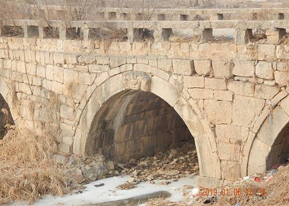 桥面青石铺路,六块条石横连十二孔桥眼,桥墩北迎水面建有分水石尖和石马、石羊、石猪迎水,桥南背水面有石龙、石虎护基,每拱桥的额部都嵌有石刻蛟龙头像,二目圆瞪,态度凛然,不怒自威。