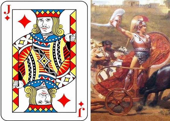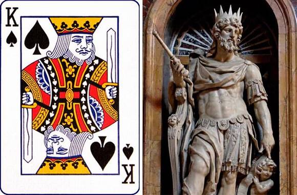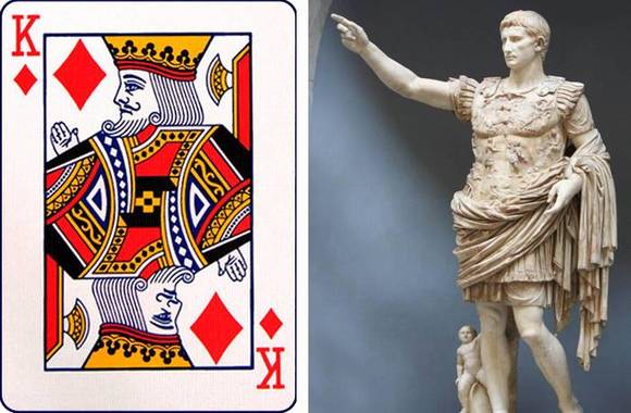 恺撒作为人类历史上最为知名的大独裁者登上扑克牌当之无愧。而且他也十分好记,那个侧面脸的扑克国王就是恺撒。据说这是源于恺撒在古罗马硬币上所刻的是侧面像。扑克牌中的斧子寓意着征服。