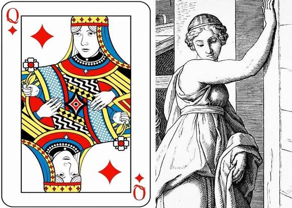 红桃Q上面的人物是朱迪斯,朱迪斯在《圣经旧约》中,是拯救以色列的大英雄。她最出名的事迹就是利用美人计,刺杀了前来侵略耶路撒冷的敌军统帅罗弗尼斯,从而拯救了以色列人民。