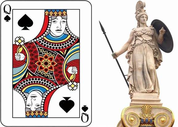 黑桃Q上面的人物是著名的智慧女神雅典娜,是Q中名气最大的一个。很多人对雅典娜的熟悉,都来自于古希腊传说,她是宇宙之神宙斯和墨提斯的女儿,也是奥林匹斯十二主神之一。