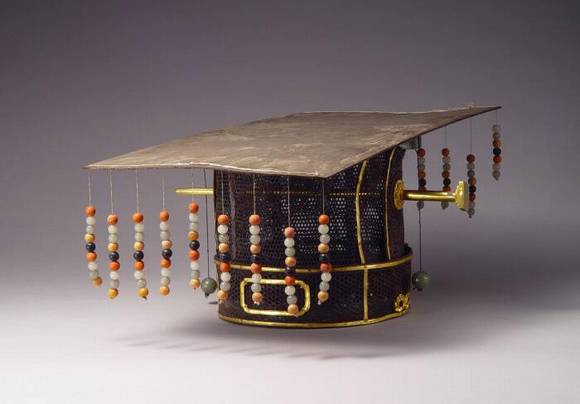 明代九旒冕,通高18厘米,长49.4厘米,宽30厘米,是朱元璋第十子鲁王朱檀所佩戴的冕,为九旒。藤篾(miè)编制,表面敷罗绢黑漆,镶以金圈、金边。冠的两侧有梅花金穿,贯一金簪。这是我国目前发现的唯一一件保存完好的明初亲王冕冠实物,是研究我国古代服饰、礼制极为珍贵的实物资料。