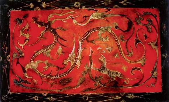 西汉梁王刘买墓室主室里的壁画,青龙、朱雀、白虎、怪兽四神,同在云气勾勒的颇富装饰感的“画框”(上部是开放的)中,遨游云天;相伴它们的,是祥云、荷花、灵芝等。