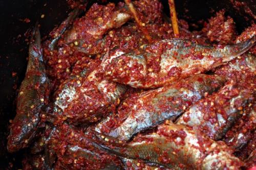 好客的侗家,客人来了,席上必须有鱼。通常吃的是香气 四溢的腌鱼,每年腊月,将草鱼或鲤鱼从塘里捉上来,破去内脏,擦上食盐,风干水气,然后切成小块,洒上研碎的红米粉,放进坛子腌好,能保存一两年。来了客人炒上腌鱼,风味别具一格。有时也从塘里弄几条跳蹦蹦的鲜鱼招待客人。如果席上无鱼,便被视为看不起人。
