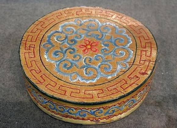 6、玻璃镶嵌装饰法,这种装饰方法在达斡尔族出现比较晚,多用在桦树皮器物上的盖子上,桦树皮器的的盖子以双层桦树皮缝合而成,多半是在缝合前把形状适合的玻璃夹在两层桦树皮之间,多呈圆形或花瓣边圆形、方形等。后又在玻璃的底面绘彩绘花草纹,产生一种透明的独特彩绘效果;