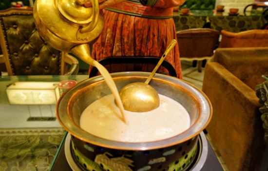 马奶酒性温,有驱寒、舒筋、活血、健胃等功效。被称为元玉浆,是"蒙古八珍"之一。曾为元朝宫廷和蒙古贵族府第的主要饮料。忽必烈还常把它盛在珍贵的金碗里,犒赏有功之臣。当你踏上草原,走进蒙古包后,热情好客的蒙古人便会将美酒斟在银碗或金杯中,托在长长的哈达上,唱起动人的敬酒歌,款待远方的贵客,以表达自己的诚挚之情。这时,客人理应随即接住酒,然后能饮则饮,不能饮品尝少许,便可将酒归还主人。若是推推让让,拉拉扯扯,不喝酒,就会被认为是瞧不起主人,不愿以诚相见等等。主人的满腔热情,常常使客人产生难别之情,眷恋之感。