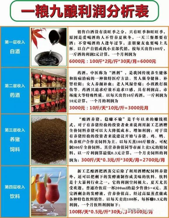 传统酿酒工艺利润:100斤(粮食)×50%左右(出酒率)×6元/斤(酒)=300元