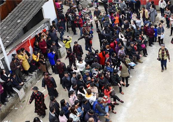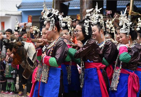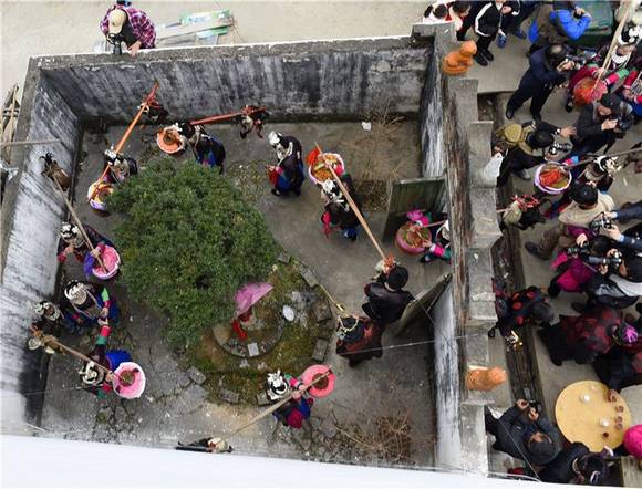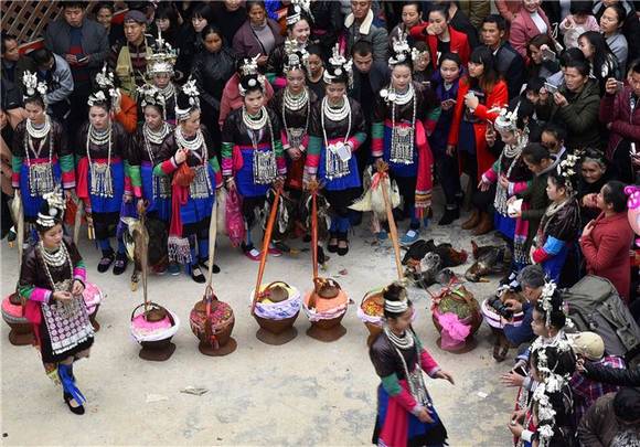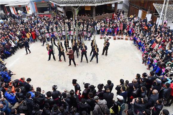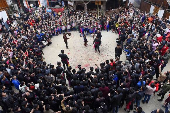 正月初二早饭后,人们穿着节日盛装,男的带上鞭炮,集中在鼓楼坪。中午时分,礼炮三响,全寨年前刚做新娘的姑娘在女友的陪伴下挑着鸡和饭囿(一种竹篾编的盛饭用具)列队来到鼓楼坪。进这场仪式之后,抢鸡便在鞭炮声中开始。