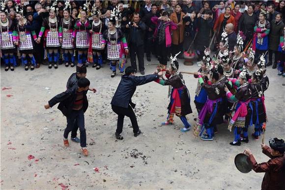在贵州省南部侗族地区从江县干团一带,现在还保留着一种鲜为人知的特殊婚俗——鼓楼抢鸡。侗族在历史上曾盛行过姑表婚俗,但现今基本已不复存在。然而,在南部侗族地区的一些地方还遗存给舅舅家送“认亲礼”的习俗,有的地方还有表兄弟邀集同伴来抢表姐妹的“黑米饭”的习俗,侗话叫“建苟嫩。
