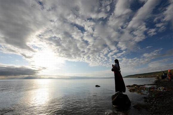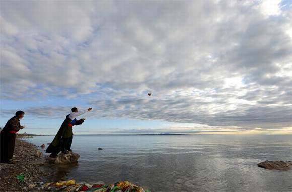 与此同时,许多老人、妇女纷纷跪在湖边,摘下身上的护身符用湖水清洗,据说这天用湖水洗护身符,可保一年平安。还有许多小伙子骑着马下湖狂奔,同样也是想获得湖神的庇佑。