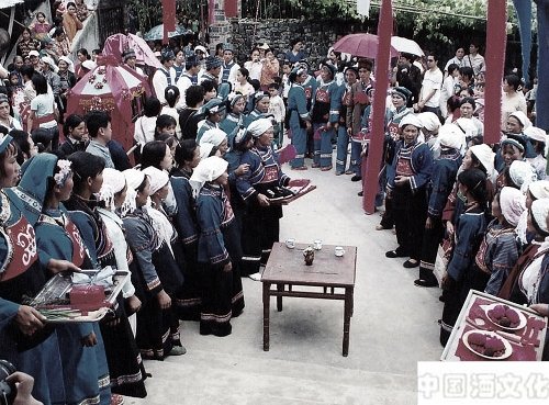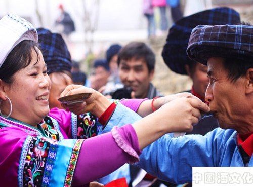 迎客歌。迎客酒就是娶嫁迎亲或逢年过节,客人来到时,主人要在大门口摆上一张桌子,桌上放酒壶和碗,客人一到,主人便在碗里斟酒,双手端起,唱迎客歌为客人献酒,如:“凤凰飞落刺笆林,鲤鱼到浅水滩,今天贵客到我家,不成招待太简慢,献上一碗淡淡水,只望客人多包涵”。客人若是能者,就以歌答道:“画眉飞上悟桐树,小虾游到大海里,今天来到富贵府,主人殷勤真好客,只因我的口福薄,这碗仙酒不敢诀。”如此对答几个回合以后,双方不分胜负,最后客人饮一口酒,就进到堂屋里。若是客人不会唱歌,主人每唱一首,客人就要喝一口酒,一直要唱七首或九首,客人也就要喝七口或九口酒以后才能罢休。