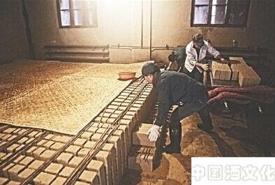 酿酒第一步便是制曲,每年端午后,酒师们开始制造曲药。曲药以小麦为原料,先将小麦粉碎,加入水和“母曲”搅拌,放在木盒子里,工人站在盒子里用脚不停地踩。“刚来的工人都受不了这个活,踩两天腿就会疼得下不了楼。”茅台制曲车间的一名工人说。