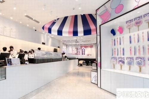 以童话为名,开展自己的白日梦之旅,这便是迪士尼小镇白日梦计划店的设计初心。粉蓝相间的主题插画布满门店,50年代后期的波谱风格漫画,让时光回溯到那个缓慢的时代,顾客在饮茶之余,随着男巫降落记的故事思绪得到延续。迷路的男巫在风雨中漂泊,遇到卖茶的小女孩,在这个最为寒冷的时刻,一杯温暖的热茶递到男巫的面前,有什么比这个更为温暖的呢?这也是喜茶的传递的真谛,这便是爱与梦想。
