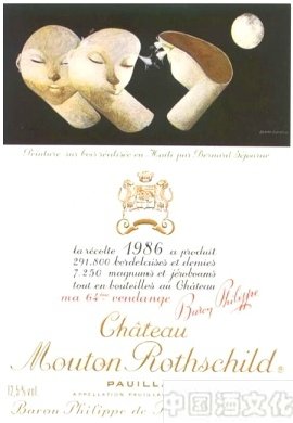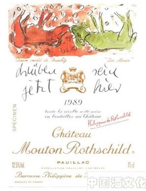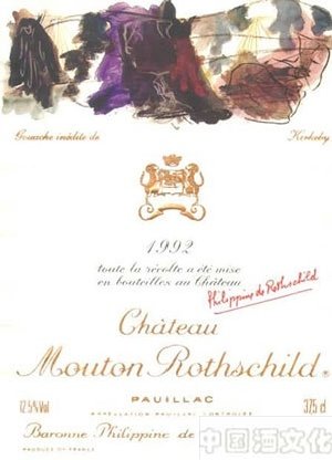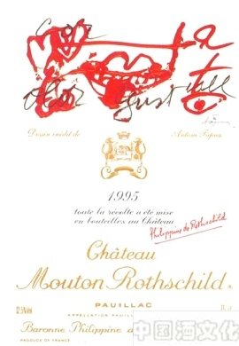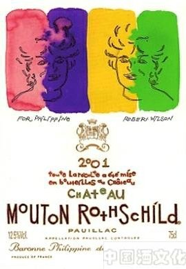 在为木桐2001设计的酒标中,艺术家用绿色表达了葡萄嫩芽,金色代表阳光,红色和紫色分别代表葡萄酒成熟的阶段,在颜色中有若隐若现庄主菲利嫔女男爵的线条形象。