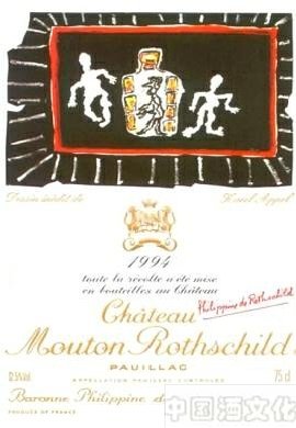 1994—卡雷尔·阿佩尔(Karel Appel)是第一个为木桐创作酒标的荷兰画家,画风粗犷而艳丽,接近美国抽象表现主义风格,作品有《自由的呼喊》、《女人与鸵鸟》。酒标作品描述了一对饮酒后的夫妇绕着绘有图腾的瓶子四周跳快步舞的场景,就像感受到了葡萄酒的生命力。