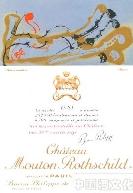 1981-阿尔曼-费尔依戴(arman-fernandez),尼斯的画家和雕刻家,1960年他和伊芙-克莱因(yves-Klein)和皮埃尔-雷斯坦利(pierre-Restany)共同建立了新现实主义学派,此学派反对抽象美学概念,着重表现日常事物,他著名的“愤怒系列”,毫不夸张的表现了物体的爆炸,特别是乐器的爆炸,乐器的零件散落各地,这个时期,他经常表现小提琴爆炸的主题,为木桐设计1981年酒标就是该画的彩色板。