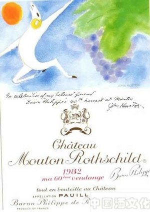 1982—约翰·休斯顿(John Huston,1906-1987)以电影导演身份为人所知,同时他还是一名拳击手,艺术爱好者,作家,驯马师,猎人以及演员,而在其生命早期,还曾是才华横溢的天才画家。他为了“祝贺我亲爱的朋友拜伦·菲利普(Baron Philippe)在木桐(Mouton)酒庄的第六十个丰收年”所绘的酒标,表达了他对朋友的友爱,以及对这片土地的迷恋。他为木桐罗斯柴尔德(Mouton Rothschild)1982年酒标所作的水彩画,是他的最后一幅作品。感性、雅致,画作用色温暖,同主题格调非常相符,一只公羊,在酒神节上欢欣起舞,身边是永不分离的同伴,太阳和葡萄树。