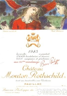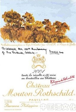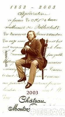2003—众所周知,自1945年以来,木桐堡酒庄每年都会邀请一位知名的画家为木桐堡酒设计酒标。木桐2003年佳酿更是一个期待,因为这将标志着一个酿酒家族五代人经营木桐酒庄150年的历史。1853年5月11日,罗思柴尔德家族的英国分支血统纳撒尼尔﹒罗思柴尔德男爵(Baron Nathaniel de Rothschild)正式拥有了木桐罗思柴尔德男爵酒庄,从1853年到2003年已经有150年的时间。为表达敬仰与缅怀之情,现任庄主罗思柴尔德菲利嫔女男爵决定将酒标的全部内容都用于描述那个历史性的年份和纳撒尼尔﹒罗思柴尔德男爵(Baron Nathaniel de Rothschild),木桐酒庄的第一代主人。标签的背景显示了当年契约转让酒庄合约的部分内容,这份合约至今仍妥善保存在木桐葡萄酒艺术博物馆,象征着罗思柴尔德男爵家族和伟大的波尔多葡萄酒几个世纪以来故事的起始。