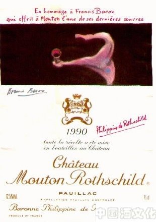 1990—弗兰西斯·培根(Francis Bacon)英国画家,于1909年10月28日出生在爱尔兰的都柏林,后来移居英国。Bacon的绘画风格曾深受西班牙画家毕加索的影响,并受到后来兴起的超现实主义风格的熏陶。他本人也是葡萄酒爱好者。作品描述的是一个怪异闪光的舞蹈似的动作。作家一直坚持自己的流派——在一种在分娩或垂危时才有的扭曲形状中表现孤独、裸体或肌肉的力量。画面底色是深色,一只有力量的手臂拿着一杯酒,动作痉挛收缩的像是哈哈镜里才有的影像。