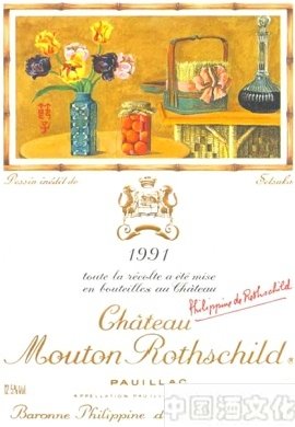 1991—1991年的木桐酒标由日本画家出田节子(Setsuko Ideta)创作,画中隐喻了葡萄酒的一生:先是一束开的花,之后是果实成熟,由人们收割,然后变成了酒。作品是他的典型风格:静物绘画,排成一排静静的五颜六色的物体。