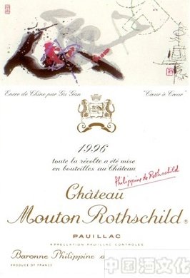 1996—中国画家兼书法家古干,为木桐创作了1996年的酒标。他也是书法艺术的创新者,首创在书法中使用色彩的墨,使之更有装饰效果。作品使用了五个不同的心形象征图案,每一个图形都有自己的颜色。这幅作品在富视觉冲击力的同时又很有寓意,名叫《心连心》。在画中,作者使用了流传千年的中国的书法元素。