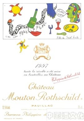 1997—庄主菲利宾女伯爵邀请她的朋友尼基·德·圣法尔(Niky de Saint Phalle)创作1997年的酒标,作者绘制了一幅寓言画似的场景:从阳光到盘子,一张贪吃的嘴和一双伸开的手,表现了用餐时的愉快,一条蛇横穿整幅画,比伊甸园里诱惑夏娃的那条蛇还有诱惑力,正在向画中人物推荐一瓶葡萄酒。